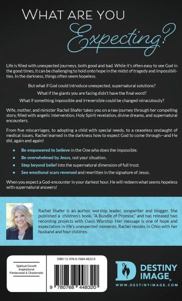 What are you expecting? Life is filled with unexpected journeys, both good and bad. While it's often easy to see God in the good times, it can be challenging to hold onto hope in the midst of tragedy and impossibilities. In the darkness, things often seem hopeless. But what if God could introduce unexpected, supernatural solutions? What if the giants you are facing didn't have the final word? What if something impossible and irreversible could be changed miraculously? Wife, mother, and minister Rachel Shafer takes you on a raw journey through her compelling story, filled with angelic intervention, Holy Spirit revelation, divine dreams, and supernatural encounters. From five miscarriages, to adopting a child with special needs, to a ceaseless onslaught of medical issues, Rachel learned in the darkness how to expect God to come through-and He did, again and again! Be empowered to believe in the One who does the impossible. Be overwhelmed by Jesus, not your situation. Step beyond belief into the supernatural dimension of full trust. See emotional scars reversed and rewritten in the signature of Jesus. When you expect a God-encounter in your darkest hour, He will redeem what seems hopeless with supernatural answers!