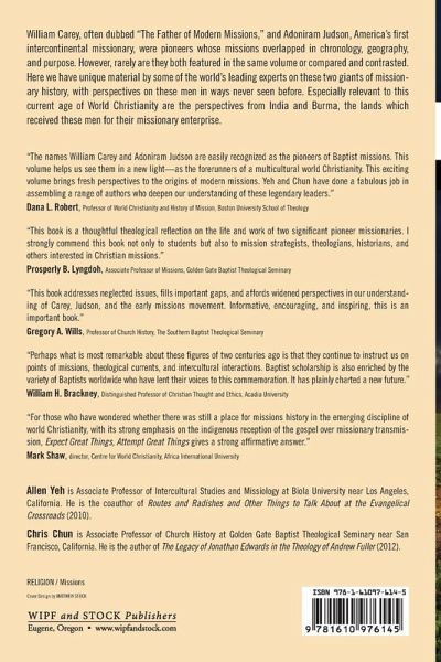 William Carey, often dubbed "The Father of Modern Missions," and Adoniram Judson, America's first intercontinental missionary, were pioneers whose missions overlapped in chronology, geography, and purpose. However, rarely are they both featured in the same volume or compared and contrasted. Here we have unique material by some of the world's leading experts on these two giants of missionary history, with perspectives on these men in ways never seen before. Especially relevant to this current age of World Christianity are the perspectives from India and Burma, the lands which received these men for their missionary enterprise.