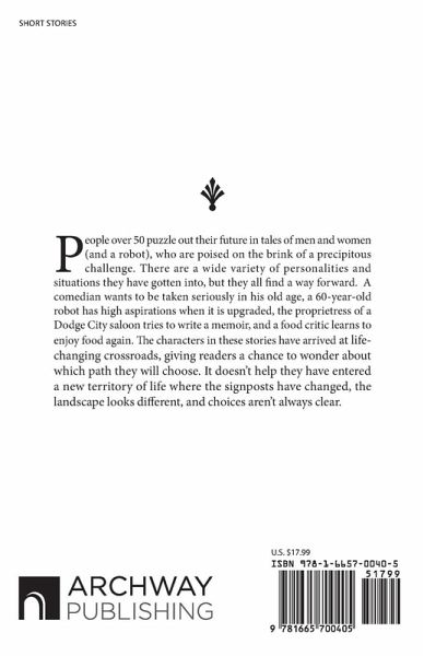 People over 50 puzzle out their future in tales of men and women (and a robot), who are poised on the brink of a precipitous challenge. There are a wide variety of personalities and situations they have gotten into, but they all find a way forward. A comedian wants to be taken seriously in his old age, a 60-year-old robot has high aspirations when it is upgraded, the proprietress of a Dodge City saloon tries to write a memoir, and a food critic learns to enjoy food again. The characters in these stories have arrived at life-changing crossroads, giving readers a chance to wonder about which path they will choose. It doesn't help they have entered a new territory of life where the signposts have changed, the landscape looks different, and choices aren't always clear.