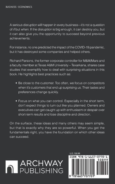 A serious disruption will happen in every business-it's not a question of if but when. If the disruption is big enough, it can destroy you, but it can also give you the opportunity to succeed beyond previous achievements. For instance, no one predicted the impact of the COVID-19 pandemic, but it has destroyed some companies and helped others. Richard Parsons, the former corporate controller for M&M/Mars and a faculty member at Texas A&M University - Texarkana, shares case studies that exemplify how to deal with surprising situations in this book. He highlights best practices such as: ¿ Be close to the customer. Too often, we focus on competitors when it's customers that end up surprising us. Their tastes and preferences change quickly. ¿ Focus on what you can control. Especially in the short term, don't expect things to turn out like you planned. Owners and executives can get caught up with enthusiasm or despair over short-term results and lose discipline and direction. On the surface, these ideas and many others may seem simple, but that is exactly why they are so powerful. When you get the fundamentals right, you have the foundation on which other ideas can succeed.