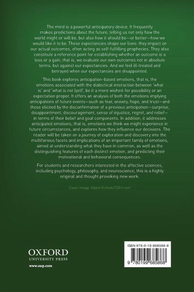The mind is a powerful anticipatory device. It frequently makes predictions about the future, telling us not only how the world might or will be, but also how it should be - or better - how we would like it to be. These expectancies shape our lives: they impact on our actual outcomes, often acting as self-fulfilling prophecies. They also constitute a reference point for establishing whether an outcome is a loss or a gain; that is, we evaluate our own outcomes not in absolute terms, but against our expectancies. And we feel ill-treated and betrayed when our expectancies are disappointed. This book explores anticipation-based emotions, that is, the emotions associated with the dialectical interaction between 'what is' and 'what is not (yet)', be it a mere wished-for possibility or an expectation proper. It offers an analysis of both the emotions implying anticipations of future events - such as fear, anxiety, hope, and trust - and those elicited by the disconfirmation of a previous anticipation - surprise, disappointment, discouragement, sense of injustice, regret, and relief - in terms of their belief and goal components. In addition, it addresses anticipated emotions, that is, emotions we think we might experience in future circumstances, and explores how they influence our decisions. The reader will be taken on a journey of exploration and discovery into the multifarious facets and implications of an important family of emotions, aimed at understanding what they have in common, as well as the distinguishing features of each distinct emotion, and predicting their motivational and behavioral consequences. For students and researchers interested in the affective sciences, including psychology, philosophy, and neuroscience, this is a highly original and thought provoking new work.