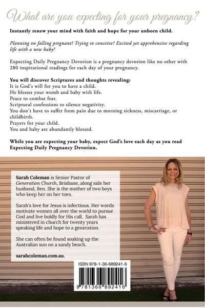 Renew your mind with faith and hope for your unborn child. Planning on falling pregnant? Trying to conceive? Excited, yet apprehensive, regarding life with a new baby? Read Expecting Daily Pregnancy Devotion for a daily dose of confidence and encouragement. Expecting Daily Pregnancy Devotion is a pregnancy devotion like no other. It has 280 inspirational readings for each day of your pregnancy. You will discover Scriptures and thoughts revealing: It is God's will for you to have a child. He blesses your womb and baby with life. Peace to combat fear. Scriptural confessions to silence negativity. You don't have to suffer from pain due to morning sickness, miscarriage, or childbirth. Prayers for your child. You and baby are abundantly blessed.While you are expecting your baby, expect God's love to shine on you each time you read Expecting Daily Pregnancy Devotion.