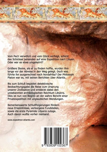 Vom Pech verwöhnt und vom Glück verfolgt, schickt das Schicksal jemanden auf eine Expedition nach Libyen. Oder war es etwa umgekehrt? Größere Steine, als er zu finden hoffte, wurden ihm lange vor der Abreise in den Weg gelegt. Doch was führte ihn ausgerechnet nach Nordafrika? Der Philosoph Platon war es, mit seinen Berichten über Atlantis. Bis zum Schluß begleitet detektivische Beobachtungsgabe die Reise zum Ursprung unserer Zivilisation und entdeckt dabei den unbekannten archäologischen Reichtum Libyens. Dies ist nun von Beginn an der wahre Bericht einer Privatexpedition mit unglaublichen Wendungen.Bemerkenswerte Schlußfolgerungen fördern neue Erkenntnisse, verborgene Fundstellen, sowiedie erste Pyramide Libyens zutage.