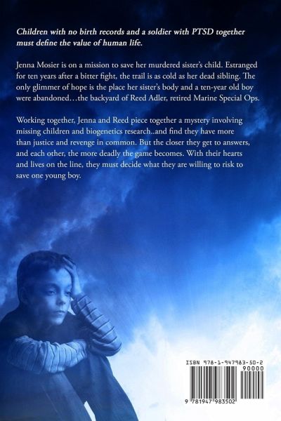 Children with no birth records and a soldier with PTSD together must define the value of human life. Jenna Mosier is on a mission to save her murdered sister’s child. Estranged for ten years after a bitter fight, the trail is as cold as her dead sibling. The only glimmer of hope is the place her sister’s body and a ten-year old boy were abandoned…the backyard of Reed Adler, retired Marine Special Ops. Working together, Jenna and Reed piece together a mystery involving missing children and biogenetics research..and find they have more than justice and revenge in common. But the closer they get to answers, and each other, the more deadly the game becomes. With their hearts and lives on the line, they must decide what they are willing to risk to save one young boy. This is the first book in a new suspense series where a group of former Marines become Shadow Finders. They help find those who have disappeared, have no identity, or are presumed dead.