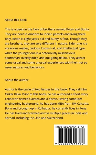 This is a peep in the lives of brothers named Ketan and Bunty. They are born in America to Indian parents and living there only. Ketan is eight years old and Bunty is four. Though they are brothers, they are very different in nature. Elder one is a voracious reader, curious, know-it-all, and intellectual type, while the younger one is a notoriously mischievous, sportsman, overtly doer, and out-going fellow. They attract some usual and some unusual experiences with their not so usual natures and behaviors.