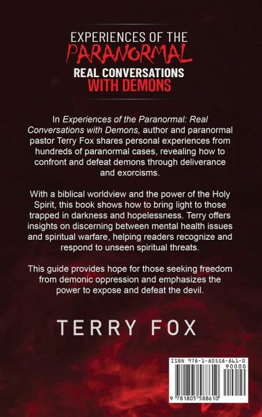 In Experiences of the Paranormal: Real Conversations with Demons, author and paranormal pastor Terry Fox shares personal experiences from hundreds of paranormal cases, revealing how to confront and defeat demons through deliverance and exorcisms. With a biblical worldview and the power of the Holy Spirit, this book shows how to bring light to those trapped in darkness and hopelessness. Terry offers insights on discerning between mental health issues and spiritual warfare, helping readers recognize and respond to unseen spiritual threats. This guide provides hope for those seeking freedom from demonic oppression and emphasizes the power to expose and defeat the devil.