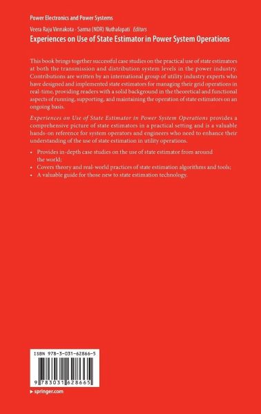 Chapter 1. PREFACE on Brief History of State Estimation.- Chapter 2. State estimation algorithms.- Chapter 3. THEORETICAL FUNDAMENTALS OF THE THREE-PHASE DISTRIBUTION STATE ESTIMATOR.- Chapter 4. ENGINEERING ASPECTS OF STATE ESTIMATION FOR REAL-TIME USE.- Chapter 5. ENGINEERING ASPECTS OF IMPLEMENTATION OF DISTRIBUTION STATE ESTIMATOR.- Chapter 6. External Modeling for State Estimation and Network Applications at BC Hydro.- Chapter 7. Some Aspects of Initial Commissioning of State Estimator.- Chapter 8. Experiences on Use of State Estimator in ERCOT Operations.- Chapter 9. Experiences on Use of State Estimator at Hydro One .- Chapter 10. Development and Improvement of State Estimation Implementation in State Grid China.- Chapter 11. Implementation and support of State Estimator in California ISO Electric Grid Operation.- Chapter 12. Implementation of State Estimator at Entergy.- Chapter 13. BC Hydro's Experience with State Estimator in real-time Operations.- Chapter 14. Use of State Estimation for Power System Grid Operations at National Grid Electricity System Operator, United Kingdom.- Chapter 15. Use of State Estimator for Grid Operations at TEPCO in Japan.- Chapter 16. Experiences in State Estimation at the Australian Energy Market Operator.- Chapter 17. EXPERIENCES ON USAGES OF STATE ESTIMATION IN INDIAN POWER SYSTEM.- Chapter 18. Implementation of Linear State Estimator: Tenaga Nasional Berhad (TNB) Malaysia Experience.- Chapter 19. Linear State Estimator for the Control Room: AEP's Experience.- Chapter 20. Implementation of Distribution Linear State Estimator: ComEd Experience.- Chapter 21. EXPERIENCES OF DISTRIBUTION STATE ESTIMATOR PRACTICAL IMPLEMENTATION.