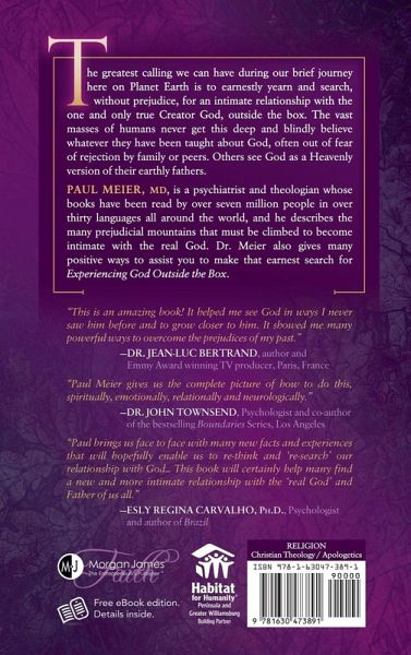 The greatest calling we can have during our brief journey here on Planet Earth is to earnestly yearn and search, without prejudice, for an intimate relationship with the one and only true Creator God, outside the box. The vast masses of humans never get this deep and blindly believe whatever they have been taught about God, often out of fear of rejection by family or peers. Others see God as a Heavenly Version of their earthly fathers. Paul Meier, MD, is a psychiatrist and theologian whose books have been read by over seven million people in over thirty languages all around the world, and he describes the many prejudicial mountains that must be climbed to become intimate with the real God. Dr. Meier also gives many positive ways to assist you to make that earnest search for "Experiencing God Outside the Box".