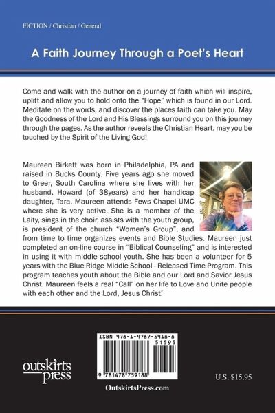 Experiencing God - Through Christian Poetry by Maureen Birkett is a book that inspires, uplifts and Glorifies God. It's like a divinely treasured walk through the life of a Christian Poet. It speaks to the heart and mind and sets one on a path of self-discovery. Hearts will be touched and changed as those who read it meditate on the words. It will become a ever present book to turn to in difficult times. It will give hope to the hopeless, strength to the weak, and inspire and uplift those in dark places.