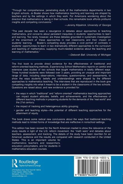 NORTH AMERICAN RIGHTS ONLY: This is a revised edition of Experiencing School Mathematics first published in 1997 by Open University Press, © Jo Boaler. This revised edition is for sale in North America only. The first book to provide direct evidence for the effectiveness of traditional and reform-oriented teaching methods, Experiencing School Mathematics reports on careful and extensive case studies of two schools that taught mathematics in totally different ways. Three hundred students were followed over three years, providing an unusual and important range of data, including observations, interviews, questionnaires, and assessments, to show the ways students' beliefs and understandings were shaped by the different approaches to mathematics teaching. The interviews that are reproduced in the book give compelling insights into what it meant to be a student in the classrooms of the two schools. Questions are raised about and new evidence is provided for: * the ways in which "traditional" and "reform oriented" mathematics teaching approaches can impact student attitude, beliefs, and achievement; *the effectiveness of different teaching methods in preparing students for the demands of the "real world" and the 21st century; *the impact of tracking and heterogeneous ability grouping; and *gender and teaching styles--the potential of different teaching approaches for the attainment of equity. The book draws some radical new conclusions about the ways that traditional teaching methods lead to limited forms of knowledge that are ineffective in non-school settings. This edition has been revised for the North American market to show the relevance of the study results in light of the U.S. reform movement, the "math wars" and debates about teachers, assessment, and tracking. The details of the study have been rewritten for an American audience and the results are compared with research conducted in the U.S. This is an important volume for mathematics teachers and researchers, education policymakers, and for students in mathematics education courses. NOTE: This is a revised edition of Experiencing School Mathematics first published in 1997 by Open University Press, © Jo Boaler. This revised edition is for sale in North America only.