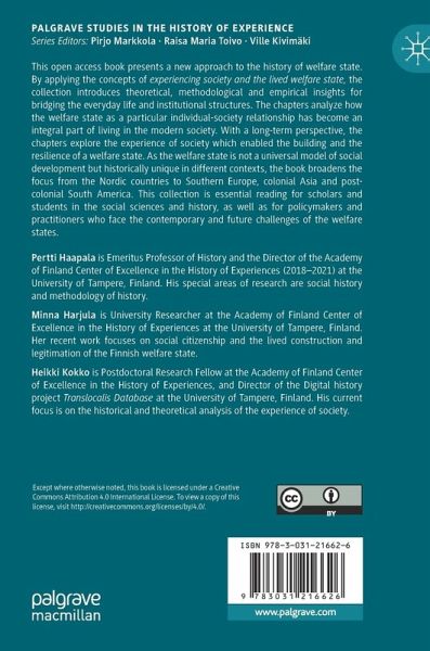 1: Introduction: Pertti Haapala, Minna Harjula, Heikki Kokko.- Part I: Theoretical and Methodological Approaches.- 2. Social History of Experiences: A Theoretical-Methodological Approach; Heikki Kokko and Minna Harjula.- 3: The Challenges or Narrating the Welfare State in the Age of Social Media: A Narrative-Theoretical Approach; Maria Mäkelä.- Part II: Experiences from Welfare Systems.- 4: Stories of Initiates: The Lived Experience of Female Social Workers in the Implementation of the Welfare State in Chile, 1925-50; Maricela Gonzáles and Paula Caffarena.- 5: Previdência Social as an Experience of Society: A Case-Study of Civil Servants in the Portuguese New State, 1933-74; Ana Carina Azevedo.- 6: A Biographical Aaccount of the Social Welfare State in Late Colonial Singapore, 1945-65; Ho Chi Tim.- Part III: Agency and Experience "From Below".- 7: Voices of the Poor: Negotiations of Social Rights in Denmark, 1849-91; Leonora Lottrup Rasmussen.- 8: Framing the Client's Agency: Generational Layers of Lived Social Work in Finland, 1940-2000; Minna Harjula.- 9: Between Gift and Entitlement: Experiencing Public Social Services and Charitable Food Aid in 2020s Finland; Anna Sofia Salonen.- Part IV: Space, Age and Class as Experience.- 10: Lived, Material and Planned Welfare: Mass-Produced Suburbanity in 1960s and 1970s Metropolitan Finland; Kirsi Saarikangas, Veera Moll, Matti O. Hannikainen.- 11: Children and the Mediated Experiences of the Welfare State: The International Year of the Child (1979) in the Finnish Public Sphere; Heidi Kurvinen.- 12: The Making of the Western Affluent Working Class: Class and Affluence through Postwar Public Discussions and Academic Interpretations; Jussi Lahtinen.- Part V: Experience of Equality and Justice.- 13: Rural (In)Justice: Smallholding as Social Policy in a Modernizing Finland, from 1945 to the 1960s; Ville Erkkilä.- 14: From Survival Mode to Utopian Dreams: Conceptions ofSociety, Social Planning and Historical Time in 1950s and 1960s Finland; Sophy Bergenheim.- 15: Welfare State in a Fair Society? Post-Industrial Finland as a Case Study; Jubo Saari.- 16: The Experience (and Constitution) of Society in Postwar and Postindustrial Finland, 1960-2020; Pertti Haapala.