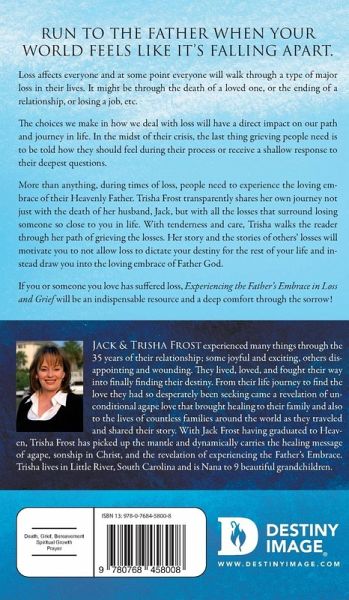 Run to the Father when your world feels like it's falling apart. Loss affects everyone and at some point everyone will walk through a type of major loss in their lives. It might be through the death of a loved one, or the ending of a relationship, or losing a job, etc. The choices we make in how we deal with loss will have a direct impact on our path and journey in life. In the midst of their crisis, the last thing grieving people need is to be told how they should feel during their process or receive a shallow response to their deepest questions. More than anything, during times of loss, people need to experience the loving embrace of their Heavenly Father. Trisha Frost transparently shares her own journey not just with the death of her husband, Jack, but with all the losses that surround losing someone so close to you in life. With tenderness and care, Trisha walks the reader through her path of grieving the losses. Her story and the stories of others' losses will motivate you to not allow loss to dictate your destiny for the rest of your life and instead draw you into the loving embrace of Father God. If you or someone you love has suffered loss, Experiencing the Father's Embrace in Loss and Grief will be an indispensable resource and a deep comfort through the sorrow!