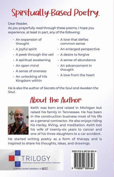 Spiritually-Based Poetry. Dear Reader, As you prayerfully read through those poems, I hope you experience, at least in part, any of the following:An expansion of thought A joyful spirit A peek through the veil A spiritual awakening An open mind A sense of oneness An unlocking of His Kingdom within A love that defies common sense An enlarged perspective A desire to forgive A sense of abundance An advancement in thought A love from the heart He is also the author of Secrets of the Soul and Awaken the Soul.