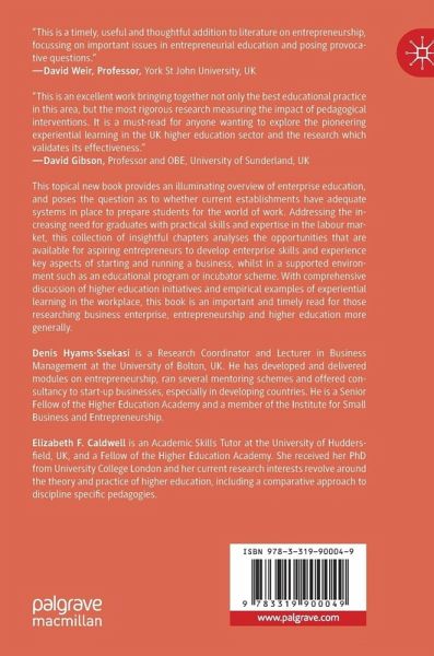 This topical new book provides an illuminating overview of enterprise education, and poses the question as to whether current establishments have adequate systems in place to prepare students for the world of work. Addressing the increasing need for graduates with practical skills and expertise in the labour market, this collection of insightful chapters analyses the opportunities that are available for aspiring entrepreneurs to develop enterprise skills and experience key aspects of starting and running a business, whilst in a supported environment such as an educational program or incubator scheme. With comprehensive discussion of higher education initiatives and empirical examples of experiential learning in the workplace, this book is an important and timely read for those researching business enterprise, entrepreneurship and higher education more generally.