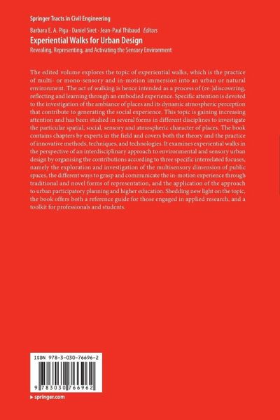The edited volume explores the topic of experiential walks, which is the practice of multi- or mono-sensory and in-motion immersion into an urban or natural environment. The act of walking is hence intended as a process of (re-)discovering, reflecting and learning through an embodied experience. Specific attention is devoted to the investigation of the ambiance of places and its dynamic atmospheric perception that contribute to generating the social experience. This topic is gaining increasing attention and has been studied in several forms in different disciplines to investigate the particular spatial, social, sensory and atmospheric character of places. The book contains chapters by experts in the field and covers both the theory and the practice of innovative methods, techniques, and technologies. It examines experiential walks in the perspective of an interdisciplinary approach to environmental and sensory urban design by organising the contributions according to three specificinterrelated focuses, namely the exploration and investigation of the multisensory dimension of public spaces, the different ways to grasp and communicate the in-motion experience through traditional and novel forms of representation, and the application of the approach to urban participatory planning and higher education. Shedding new light on the topic, the book offers both a reference guide for those engaged in applied research, and a toolkit for professionals and students.