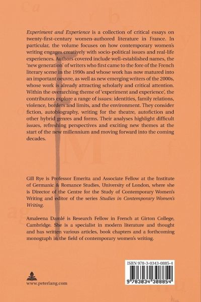 Experiment and Experience is a collection of critical essays on twenty-first-century women-authored literature in France. In particular, the volume focuses on how contemporary women's writing engages creatively with socio-political issues and real-life experiences. Authors covered include well-established names, the 'new generation' of writers who first came to the fore of the French literary scene in the 1990s and whose work has now matured into an important oeuvre, as well as new emerging writers of the 2000s, whose work is already attracting scholarly and critical attention. Within the overarching theme of 'experiment and experience', the contributors explore a range of issues: identities, family relations, violence, borders and limits, and the environment. They consider fiction, autobiography, writing for the theatre, autofiction and other hybrid genres and forms. Their analyses highlight difficult issues, refreshing perspectives and exciting new themes at the start of the new millennium and moving forward into the coming decades.