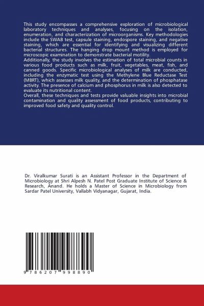 This study encompasses a comprehensive exploration of microbiological laboratory techniques and analyses, focusing on the isolation, enumeration, and characterization of microorganisms. Key methodologies include the SWAB test, capsule staining, endospore staining, and negative staining, which are essential for identifying and visualizing different bacterial structures. The hanging drop mount method is employed for microscopic examination to demonstrate bacterial motility.Additionally, the study involves the estimation of total microbial counts in various food products such as milk, fruit, vegetables, meat, fish, and canned goods. Specific microbiological analyses of milk are conducted, including the enzymatic test using the Methylene Blue Reductase Test (MBRT), which assesses milk quality, and the determination of phosphatase activity. The presence of calcium and phosphorus in milk is also detected to evaluate its nutritional content.Overall, these techniques and tests provide valuable insights into microbial contamination and quality assessment of food products, contributing to improved food safety and quality control.