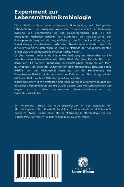 Diese Studie umfasst eine umfassende Untersuchung mikrobiologischer Labortechniken und -analysen, wobei der Schwerpunkt auf der Isolierung, Zählung und Charakterisierung von Mikroorganismen liegt. Zu den wichtigsten Methoden gehören der SWAB-Test, die Kapselfärbung, die Endosporenfärbung und die Negativfärbung, die für die Identifizierung und Visualisierung verschiedener bakterieller Strukturen unerlässlich sind. Für die mikroskopische Untersuchung wird die Methode der hängenden Tropfen eingesetzt, um die bakterielle Motilität nachzuweisen.Darüber hinaus umfasst die Studie die Schätzung der Gesamtkeimzahl in verschiedenen Lebensmitteln wie Milch, Obst, Gemüse, Fleisch, Fisch und Konserven. Es werden spezifische mikrobiologische Analysen von Milch durchgeführt, darunter der Enzymtest mit dem Methylenblau-Reduktase-Test (MBRT), der die Milchqualität bewertet, und die Bestimmung der Phosphatase-Aktivität. Außerdem wird der Kalzium- und Phosphorgehalt der Milch ermittelt, um ihren Nährstoffgehalt zu bewerten.Insgesamt liefern diese Verfahren und Tests wertvolle Erkenntnisse über die mikrobielle Kontamination und die Qualitätsbewertung von Lebensmitteln und tragen so zu einer verbesserten Lebensmittelsicherheit und Qualitätskontrolle bei.