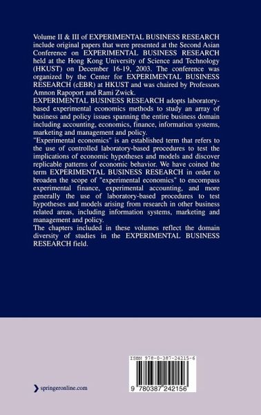 Volume II and III of Experimental Business Research include original papers that were presented at the Second Asian Conference on Experimental Business Research held at the Hong Kong University of Science and Technology (HKUST) on December 16-19, 2003. The conference was organized by the Center for Experimental Business Research (cEBR) at HKUST and was chaired by Professors Amnon Rapoport and Rami Zwick.