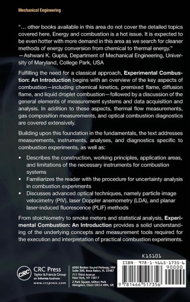 Fulfilling the need for a classical approach, Experimental Combustion: An Introduction begins with an overview of the key aspects of combustion-including chemical kinetics, premixed flame, diffusion flame, and liquid droplet combustion-followed by a discussion of the general elements of measurement systems and data acquisition and analysis. In addition to these aspects, thermal flow measurements, gas composition measurements, and optical combustion diagnostics are covered extensively. Building upon this foundation in the fundamentals, the text addresses measurements, instruments, analyses, and diagnostics specific to combustion experiments, as well as: Describes the construction, working principles, application areas, and limitations of the necessary instruments for combustion systems Familiarizes the reader with the procedure for uncertainty analysis in combustion experiments Discusses advanced optical techniques, namely particle image velocimetry (PIV), laser Doppler anemometry (LDA), and planar laser-induced fluorescence (PLIF) methods From stoichiometry to smoke meters and statistical analysis, Experimental Combustion: An Introduction provides a solid understanding of the underlying concepts and measurement tools required for the execution and interpretation of practical combustion experiments.