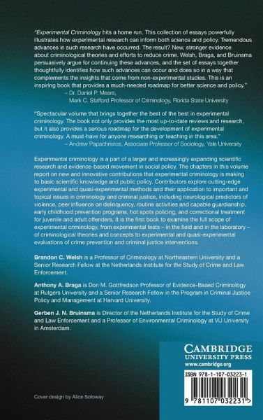 Foreword Philip J. Cook; Preface; 1. Experimenting with crime and criminal justice Brandon C. Welsh, Anthony A. Braga and Gerben J. N. Bruinsma; Part I. Experimenting with Crime: 2. Experimental tests of criminological theory Jean Marie McGloin and Kyle J. Thomas; 3. Experimental neurocriminology: etiology and treatment Adrian Raine, Michael Rocque and Brandon C. Welsh; 4. Computer simulation experiments and the development of criminological theory Christopher J. Sullivan; 5. Experiments in guardianship research Maud van Bavel and Henk Elfers; Part II. Experimenting with Crime Prevention and Criminal Justice: 6. Randomized experiments in criminology: what has been learned from long-term follow-ups? David P. Farrington and Brandon C. Welsh; 7. Increasing equivalence in small sample place-based experiments: taking advantage of block randomization methods Charlotte E. Gill and David Weisburd; 8. Multisite randomized trials in criminology Doris Layton MacKenzie, Janani Umamaheswar and Li-Chen Lin; 9. Using regression discontinuity designs in crime research Emily G. Owens and Jens Ludwig; 10. Quasi-experimentation when random assignment is not possible: observations from practical experiences in the field Anthony A. Braga; 11. Systematic reviews and cost-benefit analyses: toward evidence-based crime policy Brandon C. Welsh, Peter H. van der Laan and Meghan E. Hollis; Part III. Assessing Research Evidence and Future Directions: 11. Systematic reviews and cost-benefit analyses: toward evidence-based crime policy Brandon C. Welsh, Peter H. van der Laan and Meghan E. Hollis; 12. Integrating experimental and observational methods to improve criminology and criminal justice policy Anthony A. Braga, Brandon C. Welsh and Gerben J. N. Bruinsma.