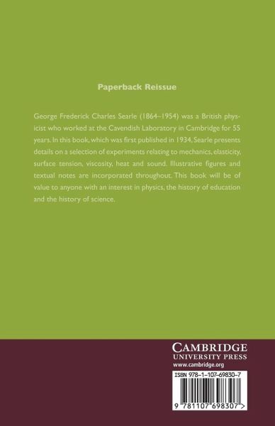 George Frederick Charles Searle (1864-1954) was a British physicist who worked at the Cavendish Laboratory in Cambridge for 55 years. In this book, which was first published in 1934, Searle presents details on a selection of experiments relating to mechanics, elasticity, surface tension, viscosity, heat and sound. Illustrative figures and textual notes are incorporated throughout. This book will be of value to anyone with an interest in physics, the history of education and the history of science.