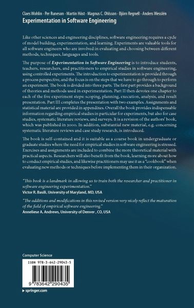 The purpose of Experimentation in Software Engineering is to introduce students, teachers, researchers, and practitioners to empirical studies in software engineering, using controlled experiments. The introduction to experimentation is provided through a process perspective, and the focus is on the steps that we have to go through to perform an experiment. The book is divided into three parts. The first part provides a background of theories and methods used in experimentation. Part II then devotes one chapter to each of the five experiment steps: scoping, planning, execution, analysis, and result presentation. Part III completes the presentation with two examples. Assignments and statistical material are provided in appendixes. Overall the book provides indispensable information regarding empirical studies in particular for experiments, but also for case studies, systematic literature reviews, and surveys. It is a revision of the authors' book, which was published in 2000. In addition, substantial new material, e.g. concerning systematic literature reviews and case study research, is introduced.