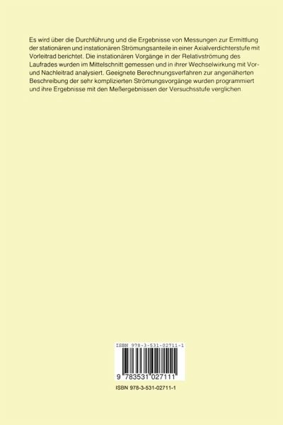 Die Untersuchung der Relativströmung im Laufrad einer Axial verdichterstufe soll einen praxisnahen Beitrag zur Erfassung der durch die Einflüsse eines vor- bzw. nachgeschalteten Leit rades sehr komplexen Strömungsvorgänge liefern. Die Strömungs fluktuationen aufgrund der Wechselwirkung zwischen stehenden und rotierenden Gittern nehmen Einfluß auf die innere Energie umwandlung. auf die Erregung von Schaufelschwingungen. auf Grenzschichtverhalten sowie Ablösevorgänge und - als Folg- auf die Verluste und die Lärmerzeugung. Die Beschreibung der Vorgänge läßt sich aufspalten in eine potential-theoretische Betrachtungsweise und eine mit Berück sichtigung der Einflüsse des realen Fluids. Die Einflußgrößen der potential-theoretischen Wechselwirkung relativ zueinander bewegter Schaufelreihen sind zunächst ein mal geometrischer Art. Die Profil- und Gittergeometrie sowie die Axialspaltweiten zwischen benachbarten Schaufelreihen be einflussen diese Wechselwirkungen wesentlich. Weitere Einfluß größen sind die Drehzahl des Rotors und die Kompressibilität des StrömungsfluidS. Theoretische Lösungen zu diesem Problemkreis [9;10;11J wurden bisher überwiegend bei quasistationärer BetraChtung verschie dener relativer Positionen der Leit- und Laufschaufelreihen erstellt. Ergebnisse eines Differenzenverfahrens nach Ispas [12J sind im Abschnitt 6.2.1 vorgestellt. In der realen zähigkeitsbehafteten Strömung bilden sich auf grund der ProfilgrenzschiChten Nachlaufdellen hinter den Schau felaustrittskanten. Im Bereich dieser Nachlaufdellen ergibt sich für nachgeschaltete relativ bewegte Schaufelreihen ein Gebiet der Falschanströmung. Für Verdichter wirkt sich diese periodische Falschanströmung (s. Abb. 26) in einer Erhöhung der Umlenkung durch das FOlgegitter aus.