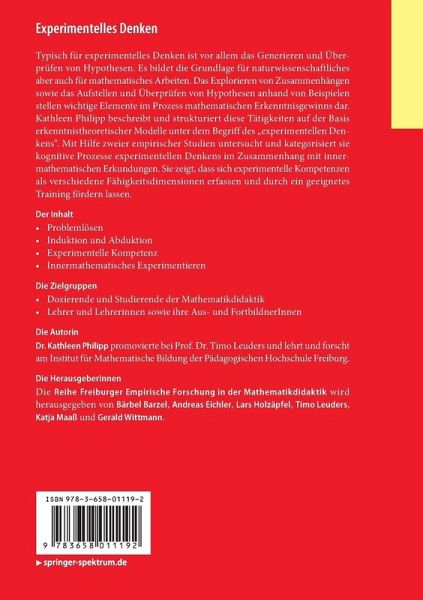 Typisch für experimentelles Denken ist vor allem das Generieren und Überprüfen von Hypothesen. Es bildet die Grundlage für naturwissenschaftliches aber auch für mathematisches Arbeiten. Das Explorieren von Zusammenhängen sowie das Aufstellen und Überprüfen von Hypothesen anhand von Beispielen stellen wichtige Elemente im Prozess mathematischen Erkenntnisgewinns dar. Kathleen Philipp beschreibt und strukturiert diese Tätigkeiten auf der Basis erkenntnistheoretischer Modelle unter dem Begriff des "experimentellen Denkens". Mit Hilfe zweier empirischer Studien untersucht und kategorisiert sie kognitive Prozesse experimentellen Denkens im Zusammenhang mit innermathematischen Erkundungen. Sie zeigt, dass sich experimentelle Kompetenzen als verschiedene Fähigkeitsdimensionen erfassen und durch ein geeignetes Training fördern lassen.