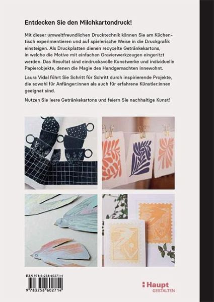Alte Getränkekartons für kreative Zwecke nutzen und nachhaltige Kunst feiern.Ohne großen Aufwand in die Druckgrafik einsteigen.Keine giftigen Farben, zugängliche Materialien, wenig Platzbedarf.Mit recycelten Getränkekartons und Alltagsmaterialien lassen sich mit oder ohne Druckpresse eindrucksvolle Kunstwerke gestalten. Diese innovative Drucktechnik ist leicht zu Hause anzuwenden und umweltfreundlich, denn als Druckplatte werden Milch- oder Saftkartons verwendet, in welche das Motiv mit einfachen Gravierwerkzeugen eingeritzt wird.Laura Vidal stellt nach einer kurzen Einführung in die Druckgrafik verschiedene Drucktechniken wie Hochdruck, Tiefdruck, Letterpress oder die Blindprägung vor und zeigt inspirierende Projekte, die sowohl für Anfänger:innen als auch für erfahrene Künstler:innen geeignet sind. So entstehen geprägte Notizbücher, ein Pflanzen-Memory, Miniaturbilder oder Briefumschläge in kleinen Auflagen.
