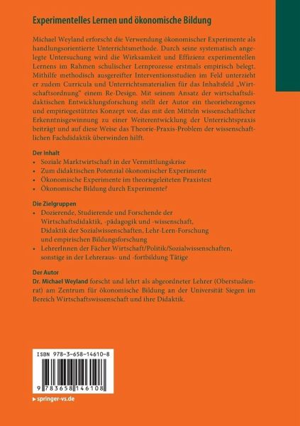 Michael Weyland erforscht die Verwendung ökonomischer Experimente als handlungsorientierte Unterrichtsmethode. Durch seine systematisch angelegte Untersuchung wird die Wirksamkeit und Effizienz experimentellen Lernens im Rahmen schulischer Lernprozesse erstmals empirisch belegt. Mithilfe methodisch ausgereifter Interventionsstudien im Feld unterzieht er zudem Curricula und Unterrichtsmaterialien für das Inhaltfeld "Wirtschaftsordnung" einem Re-Design. Mit seinem Ansatz der wirtschaftsdidaktischen Entwicklungsforschung stellt der Autor ein theoriebezogenes und empiriegestütztes Konzept vor, das mit den Mitteln wissenschaftlicher Erkenntnisgewinnung zu einer Weiterentwicklung der Unterrichtspraxis beiträgt und auf diese Weise das Theorie-Praxis-Problem der wissenschaftlichen Fachdidaktik überwinden hilft.