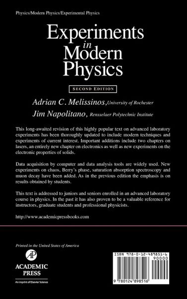 "Clear, detailed, and explicit. The coverage is great. The book is very complete and the experiments cover many subfields of physics in a balanced way. Melissinos was a classic. A modernized Melissinos is a clear need....I like the broad coverage of the book and the level of technical detail. I certainly will want to have it on my bookshelf." --Hans-Otto Meyer, Indiana University