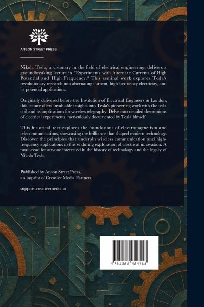 Nikola Tesla, a visionary in the field of electrical engineering, delivers a groundbreaking lecture in "Experiments with Alternate Currents of High Potential and High Frequency." This seminal work explores Tesla's revolutionary research into alternating current, high-frequency electricity, and its potential applications. Originally delivered before the Institution of Electrical Engineers in London, this lecture offers invaluable insights into Tesla's pioneering work with the tesla coil and its implications for wireless telegraphy. Delve into detailed descriptions of electrical experiments, meticulously documented by Tesla himself. This historical text explores the foundations of electromagnetism and telecommunications, showcasing the brilliance that shaped modern technology. Discover the principles that underpin wireless communication and high-frequency applications in this enduring exploration of electrical innovation. A must-read for anyone interested in the history of technology and the legacy of Nikola Tesla. This work has been selected by scholars as being culturally important, and is part of the knowledge base of civilization as we know it. This work is in the public domain in the United States of America, and possibly other nations. Within the United States, you may freely copy and distribute this work, as no entity (individual or corporate) has a copyright on the body of the work. Scholars believe, and we concur, that this work is important enough to be preserved, reproduced, and made generally available to the public. We appreciate your support of the preservation process, and thank you for being an important part of keeping this knowledge alive and relevant.