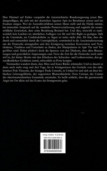 Den Himmel auf Erden verspricht die österreichische Bundesregierung jenen Bindungswilligen, die sich mit der deutschen Agentur Apis ins Benehmen setzen und ins Examen steigen. Wer im Auswahlverfahren seinen Mann stellt und die Hürde nimmt, hat immerhin Anspruch auf die staatliche Partnerversicherung und zugleich die unumstößliche Gewissheit, dass seine Beziehung Bestand hat. Und dies, wiewohl es nachweislich kein Leichtes ist, sämtlichen Auflagen von Mr und Mrs Right zu genügen. Sich in die Umstände, ins Unabänderliche zu fügen ist indes nicht drin. Eh klar, dass dadurch und namentlich durch die Unmöglichkeit, vermittelnd in die Auseinandersetzung um die Homoehe einzugreifen und den Königsweg zwischen Konvention und Nonchalance, Tradition und Fortschritt zu finden, der Manipulation in Apis Tür und Tor geöffnet wird. Dabei pfeifen's doch die Spatzen von den Dächern, dass allen Beteuerungen und gesetzlichen Anpassungen zum Trotz die Zeit für die Homoehe noch nicht reif ist, der kleine Moritz mit den Klischees des Schwulen- und Lesbenvereins, den gesundheitlichen Gefahren zumal, schwerlich zu Potte kommt. - Niemanden wundert drum, dass Hinz und Kunz Ränke schmiedet. Und so dauert es denn auch nicht ewig und drei Tage, bis in Königswiesen das Gerücht von der aidskranken Pole-Tänzerin, der hiesigen Paula Untucht, in Umlauf ist und sich an ihrer lesbischen Lebensgefährtin, der zugereisten Blumenbinderin Flora Untraut, der Unmut der oberösterreichischen Gemeinde entzündet. Es heißt schlicht, dass die grassierende Angst im Ort allein auf das Konto der Stuttgarterin gehe.