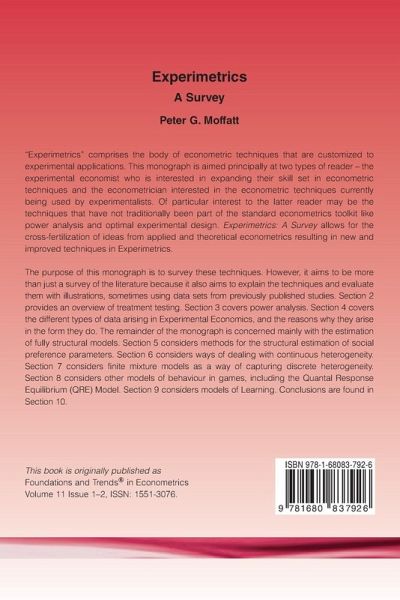 "Experimetrics" comprises the body of econometric techniques that are customized to experimental applications. This monograph is aimed principally at two types of reader -- the experimental economist who is interested in expanding their skill set in econometric techniques and the econometrician interested in the econometric techniques currently being used by experimentalists. Of particular interest to the latter reader may be the techniques that have not traditionally been part of the standard econometrics toolkit like power analysis and optimal experimental design. Experimetrics: A Survey allows for the cross-fertilization of ideas from applied and theoretical econometrics resulting in new and improved techniques in Experimetrics. The purpose of this monograph is to survey these techniques. However, it aims to be more than just a survey of the literature because it also aims to explain the techniques and evaluate them with illustrations, sometimes using data sets from previously published studies. Section 2 provides an overview of treatment testing. Section 3 covers power analysis. Section 4 covers the different types of data arising in Experimental Economics, and the reasons why they arise in the form they do. The remainder of the monograph is concerned mainly with the estimation of fully structural models. Section 5 considers methods for the structural estimation of social preference parameters. Section 6 considers ways of dealing with continuous heterogeneity. Section 7 considers finite mixture models as a way of capturing discrete heterogeneity. Section 8 considers other models of behavior in games, including the Quantal Response Equilibrium (QRE) Model. Section 9 considers models of Learning. Conclusions are found in Section 10.