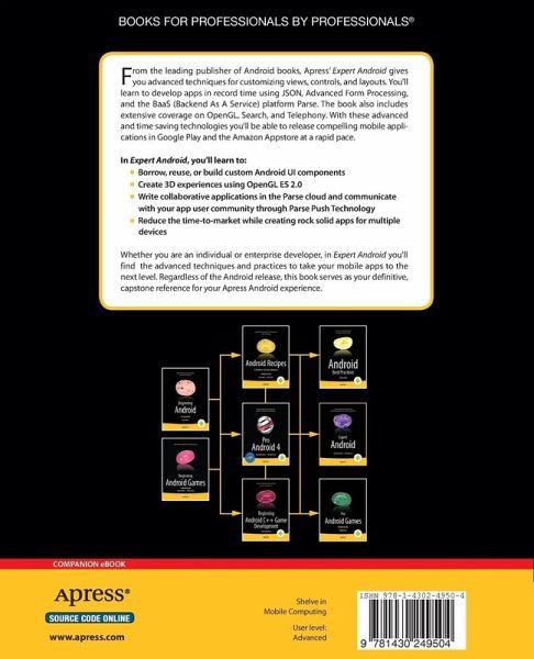 From the leading publisher of Android books, Apress' Expert Android gives you advanced techniques for customizing views, controls, and layouts. You'll learn to develop apps in record time using JSON, Advanced Form Processing, and the BaaS (Backend As A Service) platform Parse. The book also includes extensive coverage on OpenGL, Search, and Telephony. With these advanced and time saving technologies you'll be able to release compelling mobile applications in Google Play and the Amazon Appstore at a rapid pace.