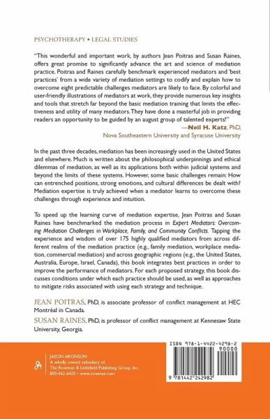 To speed up the learning curve of mediation expertise, Jean Poitras and Susan Raines have benchmarked the mediation process in Expert Mediators. For each proposed strategy, this book discusses conditions under which each practice should be used as well as approaches to mitigate risks associated with using each strategy and technique.