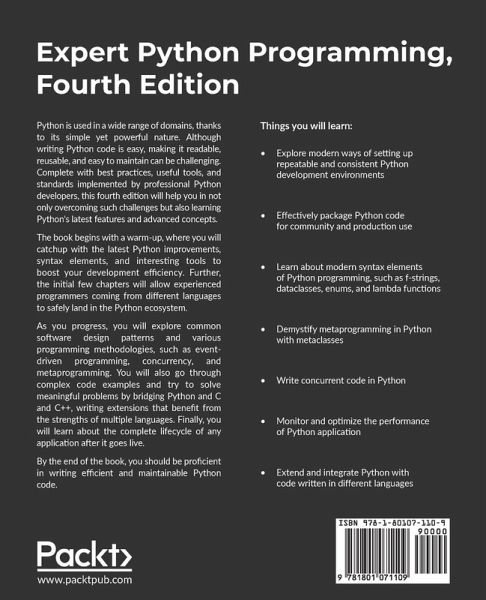 Attain a deep understanding of building, maintaining, packaging, and shipping robust Python applications Key Features:Discover the new features of Python, such as dictionary merge, the zoneinfo module, and structural pattern matching Create manageable code to run in various environments with different sets of dependencies Implement effective Python data structures and algorithms to write, test, and optimize code Book Description: Python is used in a wide range of domains owing to its simple yet powerful nature. Although writing Python code is easy, making it readable, reusable, and easy to maintain can be challenging. Complete with best practices, useful tools, and standards implemented by professional Python developers, this fourth edition will help you in not only overcoming such challenges but also learning Python's latest features and advanced concepts. The book begins with a warm-up, where you will catch-up with the latest Python improvements, syntax elements, and interesting tools to boost your development efficiency. Further, the initial few chapters should allow experienced programmers coming from different languages to safely land in the Python ecosystem. As you progress, you will explore common software design patterns and various programming methodologies, such as event-driven programming, concurrency, and metaprogramming. You will also go through complex code examples and try to solve meaningful problems by bridging Python with C and C++, writing extensions that benefit from the strengths of multiple languages. Finally, you will understand the complete lifetime of any application after it goes live. By the end of the book, you should be proficient in writing efficient and maintainable Python code. What You Will Learn:Explore modern ways of setting up repeatable and consistent Python development environments Effectively package Python code for community and production use Learn modern syntax elements of Python programming, such as f-strings, enums, and lambda functions Demystify metaprogramming in Python with metaclasses Write concurrent code in Python Extend and integrate Python with code written in different languages Who this book is for: The Python programming book is intended for expert programmers who want to learn Python's advanced-level concepts and latest features. Anyone who has basic Python skills should be able to follow the content of the book, although it might require some additional effort from less experienced programmers. It should also be a good introduction to Python 3.9 for those who are still a bit behind and continue to use other older versions.