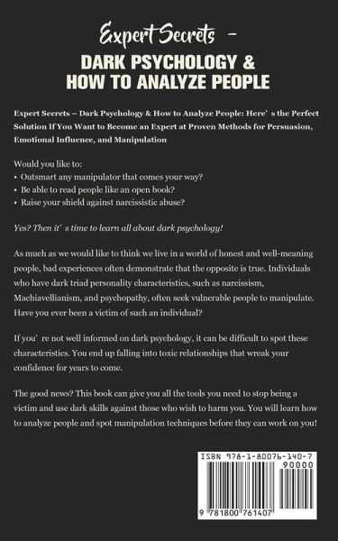 Expert Secrets - Dark Psychology & How to Analyze People: Here's the Perfect Solution If You Want to Become an Expert at Proven Methods for Persuasion, Emotional Influence, and Manipulation Would you like to:Outsmart any manipulator that comes your way? Be able to read people like an open book? Raise your shield against narcissistic abuse? Yes? Then it's time to learn all about dark psychology! As much as we would like to think we live in a world of honest and well-meaning people, bad experiences often demonstrate that the opposite is true. Individuals who have dark triad personality characteristics, such as narcissism, Machiavellianism, and psychopathy, often seek vulnerable people to manipulate. Have you ever been a victim of such an individual? If you're not well informed on dark psychology, it can be difficult to spot these characteristics. You end up falling into toxic relationships that wreak your confidence for years to come. The good news? This book can give you all the tools you need to stop being a victim and use dark skills against those who wish to harm you. You will learn how to analyze people and spot manipulation techniques before they can work on you! Here's what you'll learn in this self-help mastery book:Dark Triad Personalities: Who these people are, how they behave, and how to recognize the signs in people around you The Power of Emotional Influence: Strategies that can be used to manipulate emotions to get desired results, and how to protect yourself How to Analyze People: All the secrets of analyzing human behavior, including body language, words, and behaviors, so that you can spot lies immediately Manipulation and Mind Control: The mechanisms of manipulation and persuasions that are common in daily life and how to turn the tables on manipulators It's time to stop being a victim of skilled manipulators and become a master of reading people! So Scroll Up, Click On "Buy Now", and Get Your Copy!