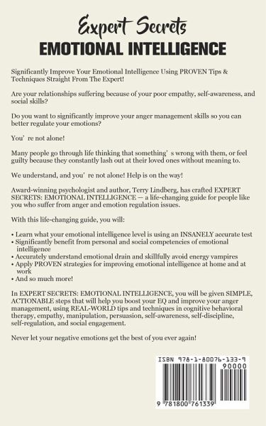 Significantly Improve Your Emotional Intelligence Using PROVEN Tips & Techniques Straight From The Expert! Are your relationships suffering because of your poor empathy, self-awareness, and social skills? Do you want to significantly improve your anger management skills so you can better regulate your emotions? You're not alone! Many people go through life thinking that something's wrong with them, or feel guilty because they constantly lash out at their loved ones without meaning to. We understand, and you're not alone! Help is on the way! Award-winning psychologist and author, Terry Lindberg, has crafted EXPERT SECRETS: EMOTIONAL INTELLIGENCE - a life-changing guide for people like you who suffer from anger and emotion regulation issues. With this life-changing guide, you will:Learn what your emotional intelligence level is using an INSANELY accurate test Significantly benefit from personal and social competencies of emotional intelligence Accurately understand emotional drain and skillfully avoid energy vampires Apply PROVEN strategies for improving emotional intelligence at home and at work And so much more! In EXPERT SECRETS: EMOTIONAL INTELLIGENCE, you will be given SIMPLE, ACTIONABLE steps that will help you boost your EQ and improve your anger management, using REAL-WORLD tips and techniques in cognitive behavioral therapy, empathy, manipulation, persuasion, self-awareness, self-discipline, self-regulation, and social engagement. Never let your negative emotions get the best of you ever again! Scroll up, Click on "Buy Now", and Start Reading!