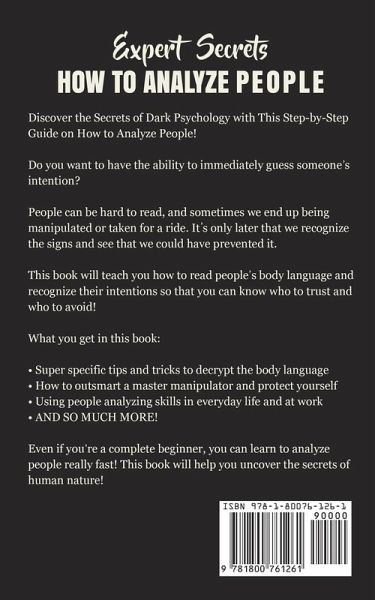 Discover the Secrets of Dark Psychology with This Step-by-Step Guide on How to Analyze People! Do you want to have the ability to immediately guess someone's intention? People can be hard to read, and sometimes we end up being manipulated or taken for a ride. It's only later that we recognize the signs and see that we could have prevented it. This book will teach you how to read people's body language and recognize their intentions so that you can know who to trust and who to avoid! What you get in this book:Super specific tips and tricks to decrypt the body language How to outsmart a master manipulator and protect yourself Using people analyzing skills in everyday life and at work AND SO MUCH MORE! Even if you're a complete beginner, you can learn to analyze people really fast! This book will help you uncover the secrets of human nature! Ready to Become a Mind Reader? Scroll up, Click on 'Buy Now', and Get Your Copy!