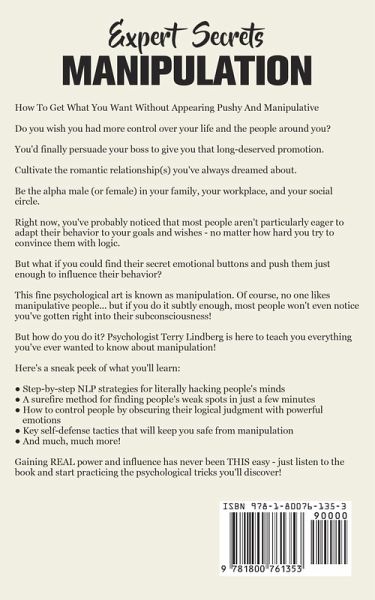 How To Get What You Want Without Appearing Pushy And Manipulative Do you wish you had more control over your life and the people around you? You'd finally persuade your boss to give you that long-deserved promotion. Cultivate the romantic relationship(s) you've always dreamed about. Be the alpha male (or female) in your family, your workplace, and your social circle. Right now, you've probably noticed that most people aren't particularly eager to adapt their behavior to your goals and wishes - no matter how hard you try to convince them with logic. But what if you could find their secret emotional buttons and push them just enough to influence their behavior? This fine psychological art is known as manipulation. Of course, no one likes manipulative people... but if you do it subtly enough, most people won't even notice you've gotten right into their subconsciousness! But how do you do it? Psychologist Terry Lindberg is here to teach you everything you've ever wanted to know about manipulation! Here's a sneak peek of what you'll learn: ¿ Step-by-step NLP strategies for literally hacking people's minds ¿ A surefire method for finding people's weak spots in just a few minutes ¿ How to control people by obscuring their logical judgment with powerful emotions ¿ Key self-defense tactics that will keep you safe from manipulation ¿ And much, much more! Gaining REAL power and influence has never been THIS easy - just read the book and start practicing the psychological tricks you'll discover! Scroll up, click on "Buy Now" and Discover The Secrets Of Manipulation Now!