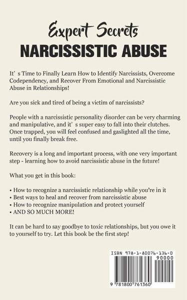It's Time to Finally Learn How to Identify Narcissists, Overcome Codependency, and Recover From Emotional and Narcissistic Abuse in Relationships! Are you sick and tired of being a victim of narcissists? People with a narcissistic personality disorder can be very charming and manipulative, and it's super easy to fall into their clutches. Once trapped, you will feel confused and gaslighted all the time, until you finally break free. Recovery is a long and important process, with one very important step - learning how to avoid narcissistic abuse in the future! What you get in this book:How to recognize a narcissistic relationship while you're in it Best ways to heal and recover from narcissistic abuse How to recognize manipulation and protect yourself AND SO MUCH MORE! It can be hard to say goodbye to toxic relationships, but you owe it to yourself to try. Let this book be the first step! ¿Ready to Become Free of Toxic Narcissists? Scroll up, Click on 'Buy Now', and Get Your Copy!