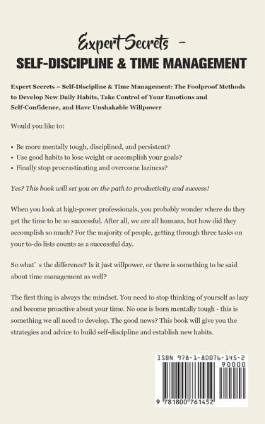 Expert Secrets - Self-Discipline & Time Management: The Foolproof Methods to Develop New Daily Habits, Take Control of Your Emotions and Self-Confidence, and Have Unshakable Willpower Would you like to:Be more mentally tough, disciplined, and persistent? Use good habits to lose weight or accomplish your goals? Finally stop procrastinating and overcome laziness? Yes? This book will set you on the path to productivity and success! When you look at high-power professionals, you probably wonder where do they get the time to be so successful. After all, we are all humans, but how did they accomplish so much? For the majority of people, getting through three tasks on your to-do lists counts as a successful day. So what's the difference? Is it just willpower, or there is something to be said about time management as well? The first thing is always the mindset. You need to stop thinking of yourself as lazy and become proactive about your time. No one is born mentally tough - this is something we all need to develop. The good news? This book will give you the strategies and advice to build self-discipline and establish new habits. Here's what you'll learn in this 2-in-1 self-help mastery book:Self-Discipline: What it means to be mentally tough, how to stop your emotions from ruining your concentration, best ways to stay consistently focused on your goals Time Management: The secrets to help you stop addiction, quite bingeing food and TV, overcome procrastination, and become a proactive go-getter Daily Habits: Understand how habits are formed, why your life is shaped by your current habits, and how to set up new habits for success Productivity: Learn how to leverage your skills and knowledge to become more productive and accomplish more in less time Once you develop bulletproof willpower, everything in your life will change. Are you ready? ¿Scroll Up, Click On "Buy Now", and Get Your Copy!