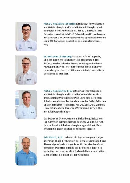 Prof. Dr. med. Marc Schnetzke ist Facharzt für Orthopädie und Unfallchirurgie und Spezielle Unfallchirurgie. Inspiriert durch einen Aufenthalt im Jahr 2013 im Deutschen Gelenkzentrum hat sich Prof. Schnetzke auf Erkrankungen des Schulter- und Ellenbogengelenkes spezialisiert und ist seit 2020 Partner im Deutschen Gelenkzentrum Heidelberg. Dr. med. Sven Lichtenberg ist Facharzt für Orthopädie, Unfallchirurgie am Deutschen Gelenkzentrum in Heidelberg. An der Seite des inzwischen ausgeschiedenen Praxispartners Prof. Peter Habermeyer hat sich Dr. Sven Lichtenberg zu einem der führenden Schulterspezialisten Deutschlands etabliert. Prof. Dr. med. Markus Loew ist Facharzt für Orthopädie und Unfallchirurgie und Spezielle Orthopädische Chirurgie. Bereits 1990 gründete Prof. Loew eine der ersten Schulterambulanzen Deutschlands an der Orthopädischen Universitätsklink Heidelberg. Von 2004 bis 2010 war Prof. Loew Präsident der Deutschen Vereinigung für Schulter- und Ellenbogenchirurgie. Felix Stasch arbeitet als Physiotherapeut in eigener Praxis. Durch Erfahrungen aus dem Leistungssport und diverse eigene Verletzungen ist es für ihn eine Berufung geworden, Patienten effektiv bei ihrer Rehabilitation zu begleiten und dabei an allen Einflussfaktoren zu arbeiten. Das Deutsche Gelenkzentrum in Heidelberg zählt zu den Top-Adressen in Deutschland und wurde vom Focus mehrfach im Bereich Schulterchirurgie ausgezeichnet.