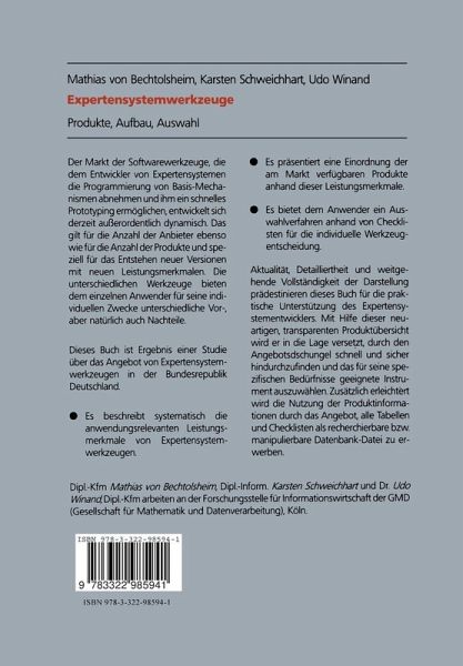 Der Markt der Softwarewerkzeuge, die dem Entwickler von Exper tensystemen die Programmierung von Basis-Mechanismen abneh men und ihm ein schnelles Prototyping ermöglichen, entwickelt sich derzeit außerordentlich dynamisch. Das gilt für die Anzahl der An bieter ebenso wie für die Anzahl der Produkte und speziell für das Entstehen neuer Versionen mit neuen Leistungsmerkmalen. Die un terschiedlichen Werkzeuge bieten dem einzelnen Anwender für sei ne individuellen Zwecke unterschiedliche Vor-, aber natürlich auch Nachteile. Dieses Buch ist Ergebnis einer Studie über das Angebot von Experten systemwerkzeugen in der Bundesrepublik Deutschland. Es beschreibt systematisch die anwendungsrelevanten Leistungs merkmale von Expertensystemwerkzeugen. Es präsentiert eine Einordnung der am Markt verfügbaren Produkte anband dieser Leistungsmerkmale. Es bietet dem Anwender ein Auswahlverfahren anband von Checklisten für die individuelle Werkzeugentscheidung. Aktualität, Detailliertheit und weitgehende Vollständigkeit der Dar stellung prädestinieren dieses Buch für die praktische Unterstützung des Expertensystementwicklers. Mit Hilfe dieser neuartigen, trans parenten Produktübersicht wird er in die Lage versetzt, durch den Angebotsdschungel schnell und sicher hindurchzufinden und das für seine spezifischen Bedürfnisse geeignete Instrument auszuwählen.