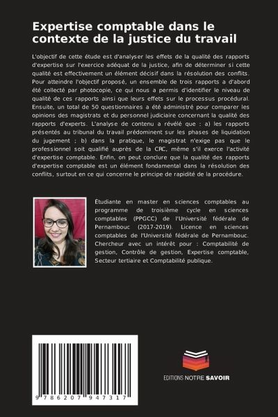 L'objectif de cette étude est d'analyser les effets de la qualité des rapports d'expertise sur l'exercice adéquat de la justice, afin de déterminer si cette qualité est effectivement un élément décisif dans la résolution des conflits. Pour atteindre l'objectif proposé, un ensemble de trois rapports a d'abord été collecté par photocopie, ce qui nous a permis d'identifier le niveau de qualité de ces rapports ainsi que leurs effets sur le processus procédural. Ensuite, un total de 50 questionnaires a été administré pour comparer les opinions des magistrats et du personnel judiciaire concernant la qualité des rapports d'experts. L'analyse de contenu a révélé que : a) les rapports présentés au tribunal du travail prédominent sur les phases de liquidation du jugement ; b) dans la pratique, le magistrat n'exige pas que le professionnel soit qualifié auprès de la CRC, même s'il exerce l'activité d'expertise comptable. Enfin, on peut conclure que la qualité des rapports d'expertise comptable est un élément fondamental dans la résolution des conflits, surtout en ce qui concerne le principe de rapidité de la procédure.