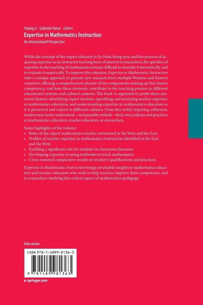 Accumulated research findings in past decades have led to the common knowledge that teachers' professional knowledge is essential to effective classroom instruction. However, there is still very limited understanding about the nature of teachers' expertise in mathematics instruction. Expertise in Mathematics Instruction addresses this need clearly and concisely. In particular, it examines all aspects of emphases employed to characterize the nature of expertise in mathematics instruction from both researchers' and practitioners' perspectives. Moreover, with research contributions from both the East and the West, this book also examines ideas pertinent to fostering and demonstrating expertise in mathematics instruction within different system contexts. This book will raise questions and issues for mathematics education researchers to guide a critical examination of what can be learned from other education systems.