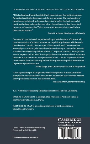 1. Experts activists and self-educating electorates T. K. Ahn Robert Huckfeldt and John Barry Ryan; 2. The imperatives of interdependence T. K. Ahn Robert Huckfeldt and John Barry Ryan; 3. Experts activists and the social communication of political expertise T. K. Ahn Robert Huckfeldt Jeanette Mendez Tracy Osborn and John Barry Ryan; 4. Unanimity discord and opportunities for opinion leadership T. K. Ahn Robert Huckfeldt Jeanette Mendez and John Barry Ryan; 5. Informational asymmetries among voters T. K. Ahn Robert Huckfeldt and John Barry Ryan; 6. Expertise and bias in political communication networks T. K. Ahn Robert Huckfeldt Alexander K. Mayer and John Barry Ryan; 7. Interdependence communication and calculation T. K. Ahn Robert Huckfeldt and John Barry Ryan; 8. Partisanship and the efficacy of social communication in constrained environments John Barry Ryan; 9. Noise bias and expertise: the dynamics of becoming informed Robert Huckfeldt Matthew Pietryka and Jack Reilly; 10. Opinion leaders expertise and the complex dynamics of political communication Robert Huckfeldt Matthew Pietryka and Jack Reilly; 11. Experts activists and democratic prospects T. K. Ahn Robert Huckfeldt and John Barry Ryan.