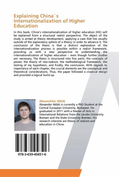 In this book, China s internationalization of higher education (HE) will be explained from a structural realist perspective. The object of the study is aimed at theory development, applying a case that lies usually outside of the explanatory sphere of a theory in order to advance it. The conclusion of the thesis is that a distinct explanation of the internationalization process is possible within a realist framework, providing us with a new perspective to understanding the internationalization of higher education even though further studies are necessary. The thesis is structured into five parts, the concepts of power, the theory of neo-realism, the methodological framework, the testing of my hypothesis, and finally, the conclusion. With regards to importance of each chapter, the crucial elements are the conceptual and theoretical considerations. Thus, the paper followed a classical design and provided a logical build up.